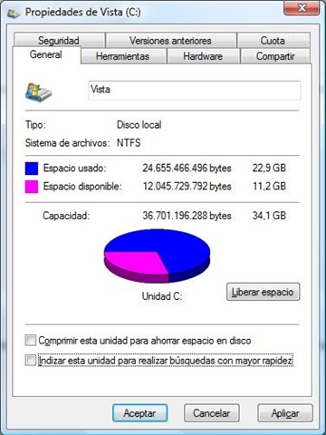 1. Desactivar el indexado en Windows Search : eso evitará que Vista esté constantemente registrando tus carpetas para que luego las búsquedas sean más rápidas. Obviamente eso impide que los resultados aparezcan instantáneamente, pero si dispones de particiones que no quieres indexar puedes desactivar esa opción. Solo basta dar click secundario en cada discu duro / partición que tengamos e ir a las Propiedades para desactivar la casilla ( click en la imágen para verla en su tamaño original )