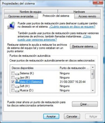 6. Desactivar la restauración del sistema : el análisis y creación de puntos de restauración consume muchos recursos, para quitarlo: Panel de control, Sistema y en la parte izquierda seleccionar el enlace "Protección del sistema". Allí tan sólo bastará desactivar la casilla de la partición de sistema, que es donde se realizan las copias de restauración, y una vez hecho eso aceptamos la confirmación final ( click en la imágen para verla en su tamaño original )