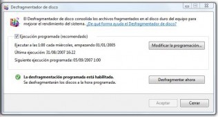4. Deshabilitar la desfragmentación automática : es bueno defragmentar de vez en cuando, pero Vista siempre lo está haciendo, así que podemos desactivarlo y dejarlo como un proceso manual para encargarnos nosotros. Para ello seleccionamos en cada disco duro / partición con el botón derecho la opción Propiedades, Herramientas y desactivamos la casilla “ Ejecutar de manera planificada ” ( click en la imágen para verla en su tamaño original )