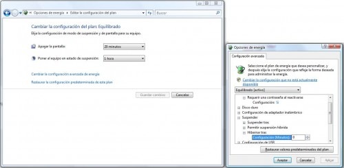 5. Desactivar la hibernación : Lo de hibernar el equipo no tiene mucho sentido a menos de que seas fiel partidario de Greenpeace y lo que representa, así que si no te lo mejor será desactivar esta característica. Para ello Panel de Control, Opciones de energía, Cambiar configuración del plan y dar click en el enlace “ Cambiar la configuración avanzada de energía ". Después desplegar el apartado Suspender, Hibernar tras y mover el selector hasta que marque cero, dar click en Aplicar ( click en la imágen para verla en su tamaño original )