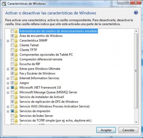 8. Quitar otros servicios que sobran : además de los servicios automáticos de los que ya hablé, es posible quitar ciertas características. Para ello vamos a Panel de Control, Programas y características. En el panel izquierdo podremos activar o desactivar características, se recomienda quitar los siguientes : Servicio de indización, Compresión Remota Diferencial, Tablet PC Optional Componentes, Windows RDF Replication Service, Windows Fax&Scan, Windows Meeting Space. Si es un usuario NO experto lo mejor es solo quitar estos servicios ( click en la imágen para verla en su tamaño original )