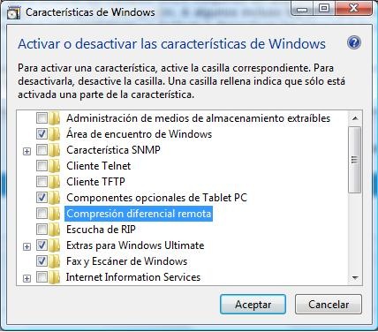 2. Desactivar la Compresión Remota Diferencial : otra idea genial de Microsoft para evaluar los cambios entre máquinas en una red a la hora de sincronizar transferencias de forma óptima. En realidad lo único que hace es molestar así que lo mejor es desactivemos esa opción. Para eliminarla vamos al Panel de Control, Vista clásica, Opciones de programas, elegir “ Activar y desactivar opciones ” y bajar hasta encontrar “ Compresión remota diferencial ” para desactivarla ( click en la imágen para verla en su tamaño original )