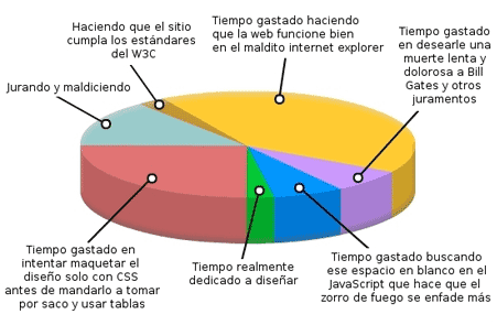 Hasta hace un par de meses continuaba con el proyecto de una mini-empresa llamada Vectorial, en ella trabajaba muchas cosas de diseño de identidades gráficas, logotipos, desarrollo de software, publicidad, etc., etc., etc y el mayor número de servicios eran de diseño de sitios web, cosa que no me desgradaba ya que es uno de " mis fuertes " pero con el paso del tiempo uno se va dando cuenta de lo complejo que puede convertirse esta actividad cuando uno trata de cumplir estándares, tendencias, funcionamientos, navegabilidad, compatibilidad, usabilidad blablabla... a lo que voy, en Blog and Web me encontré una curiosa gráfica que nos muestra las áreas y el tiempo que destinamos a cada una de ellas mientras desarrollamos un sitio web, pareciera mentira pero es verdad jajaja.