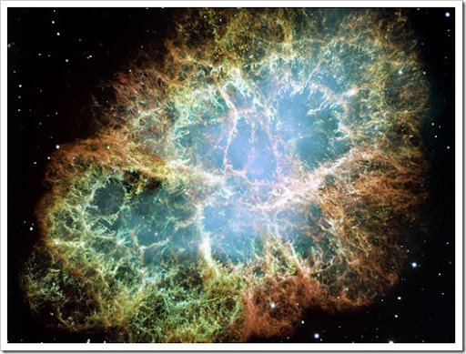 This is the mess that is left when a star explodes. The Crab Nebula, the result of a supernova seen in 1054 AD, is filled with mysterious filaments. The filaments are not only tremendously complex, but appear to have less mass than expelled in the original supernova and a higher speed than expected from a free explosion. The above image, taken by the Hubble Space Telescope, is presented in three colors chosen for scientific interest. The Crab Nebula spans about 10 light-years. In the nebula's very center lies a pulsar: a neutron star as massive as the Sun but with only the size of a small town. The Crab Pulsar rotates about 30 times each second.